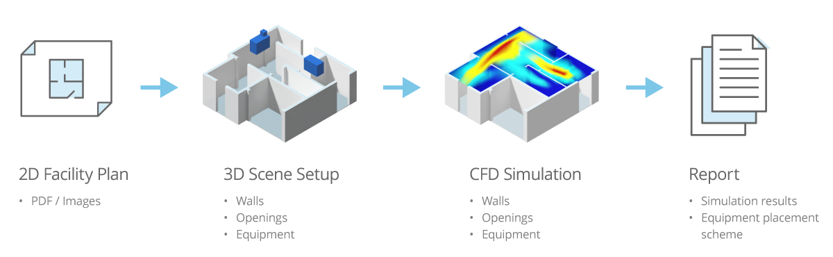 - Fully automated CFD simulations of HVAC project proposals and equipment-placing schemes.